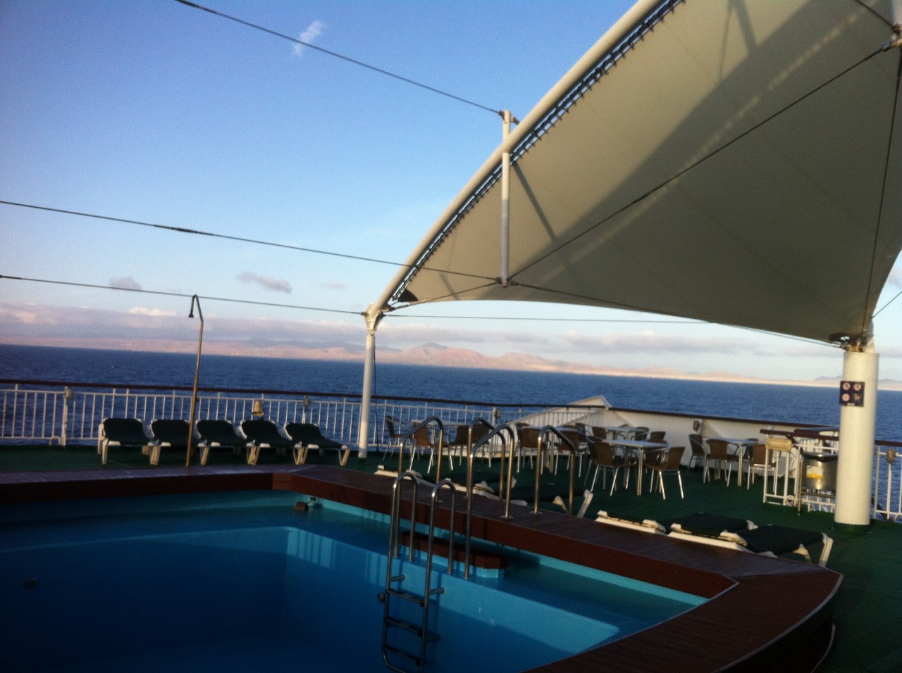 Loď je velká, dokonce hodně velká a nachází se zde i bazén. Menší komplikace nastávají, když se podíváme na čas. Už hodinu a půl jsme měli plout, ovšem neustále čekáme zde v přístavu. Nakonec se tedy rozjedeme a řítíme vstříc Lanzarote s přestávkou na Fuerteventuře, kde část posádky vysedá. Ovšem zde čekáme další hodinu a půl a to už se rovná celkem tříhodinovému zpoždění. Místo v sedm ráno jsme tedy na Lanzarote dorazili v deset a obávali se, že tyhle tři hodiny nám budou ještě někde scházet. Než jsme vyjeli, našli jsme si na internetu zajímavá místa, která by byla s to navštívit. Plán byl takový, že ihned po příjezdu na ostrov zakoupíme mapu a můžeme vyrazit. Já, jakožto zkušený a ostřílený harcovník ve stopování, hitch – hiking nebo autostop - jak chcete, jsem nabídl tuto možnost a ihned se ujala. Vždyť je to přece nejlepší způsob cestování. Cestou narazíte na fajn lidi a dostanete se prakticky kamkoliv chcete. A navíc neutratíte ani cent.