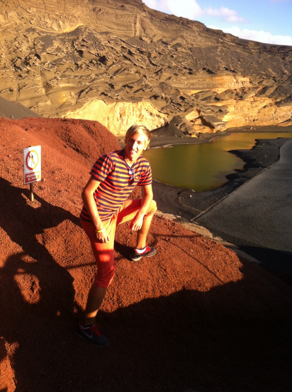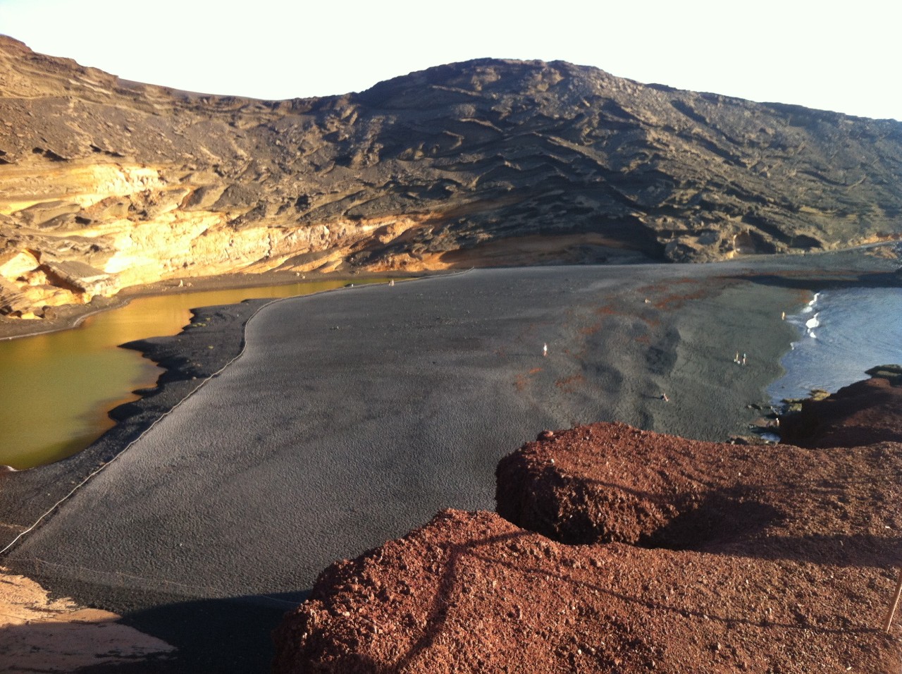 Rakouská rodinka, jakoby nám z nebe spadla, protože byla natolik hodná, že nás vzala odtud i zpátky - do civilizace. Cestou se vyptáváme, zda už byli v El Golfu, kde se nachází zelená laguna, patřící taktéž mezi oblíbená místa cestovatelů. „Ano byli, je to vskutku nádherné!“ odpovídá rodinka. „Škoda, že my už to asi nestihneme,“ nahlas povzdychujeme. Po chvilce domlouvání mezi otcem a dcerou bylo vyřčeno neočekávané: „Můžeme Vás tam hodit, pokud chcete.“ Dlouze jsme nenamítali, a tak maminka poslušně šlápla na plyn a korigovala volant směr El Golfo, přestože byla velmi hladová. Tam nám zastavili kousek od laguny a po rozloučení šli do jedné z místních rybích restaurací, které jsou zde vyhlášené. Zelenou lagunu odděluje od modrého moře pláž s černým pískem a celou podívanou obklopují oranžová a hnědá skaliska. Vskutku pastva pro oči.