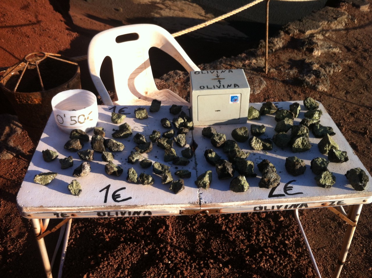 Laguna je prý zelená kvůli zvýšenému obsahu řas. Cestou k výhledu mě zaujaly stolečky, na kterých byly naskládány kameny různých velikostí a různých cen a taky uzamčená kasička. Byly velmi hezké, se zeleně se třpytícím nádechem, ovšem neměl jsem u sebe drobné a odcizit jeden z nich by mi svědomí nedovolilo.